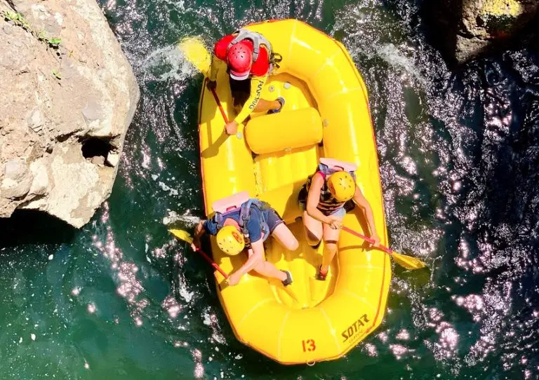 From there, we’ll drive 30 minutes to the river, where your gear (life jackets, helmets, and paddles) will be ready and a detailed safety briefing will be provided. The rafting experience lasts about 2 hours along thrilling class III–IV rapids, including the famous 12-foot drop (class V), which is optional to run.